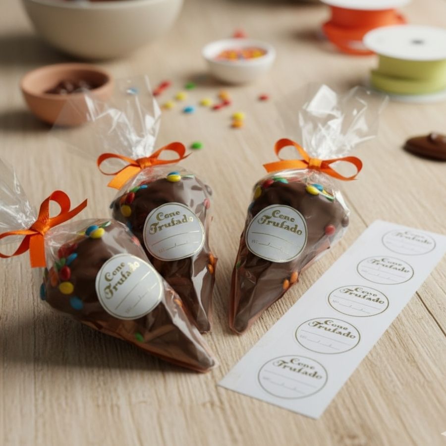O Adesivo "Cone Trufado com Validade" é ideal para identificar e personalizar embalagens de doces artesanais, especialmente cones trufados, garantindo uma apresentação profissional e organizada. O kit contém 100 unidades de adesivos com escrita dourada refletiva, que adiciona um toque elegante e atrativo às suas criações, valorizando o visual do produto e reforçando o cuidado artesanal na produção.