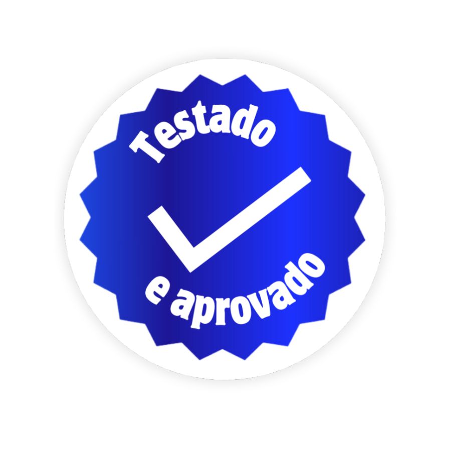 Adesivo redondo de Carnaval com a frase "Testado e Aprovado". Perfeito para festas, blocos e fantasias, garantindo mais diversão e interação na folia.