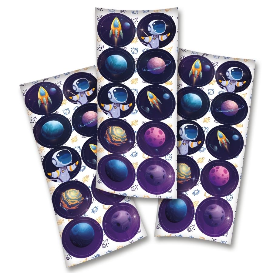Conjunto com 30 adesivos quadrados com tema espaço, medindo 9,5x22,5cm cada. Ideal para personalizar lembrancinhas, embalagens e convites, trazendo um toque lúdico e criativo à decoração da festa.