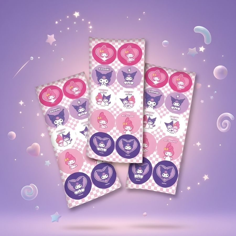 Adesivos redondos de 4cm com My Melody e Kuromi, perfeitos para personalizar embalagens e artesanato, vindo em 3 cartelas com 10 unidades cada.
