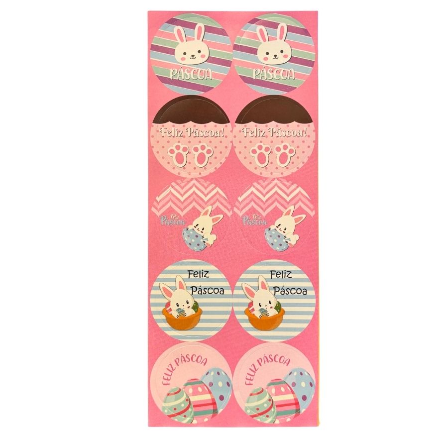 Descole o adesivo da cartela e aplique em superfícies limpas e secas, como embalagens, lembrancinhas e convites. Assim, você garante uma decoração temática e prática para sua festa de Páscoa.