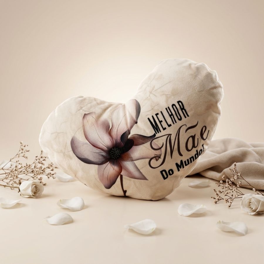 Almofada de pelúcia em formato de coração com mensagem “Melhor Mãe do Mundo”, 28x20cm, ideal para presentear com carinho e decorar com aconchego e estilo.