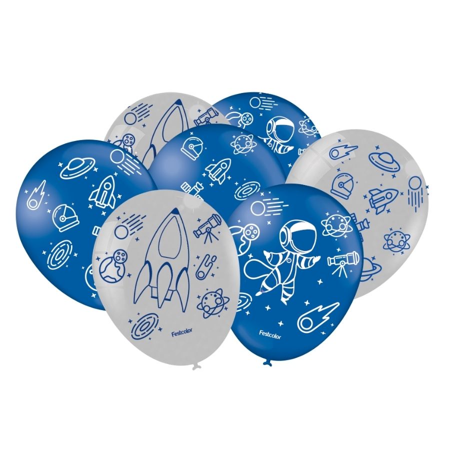 Balão de festa decorativo com tema espaço, tamanho 9", acompanha 25 unidades. Ideal para compor arcos, arranjos ou pontos de destaque na decoração de festas infantis com um toque lúdico e criativo.