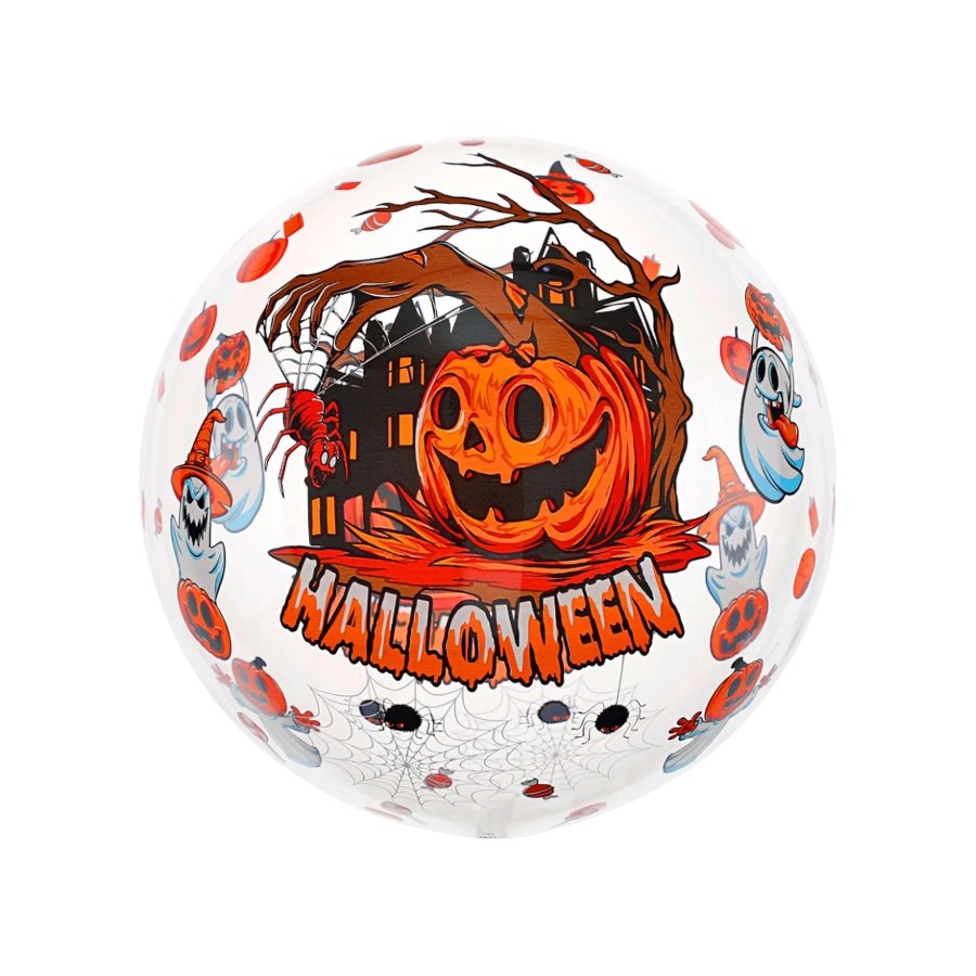 Balão bolha com estampa temática de halloween, com o fundo branco salpicado por itens de halloween, destacando uma abóbora com a palavra "Halloween" abaixo