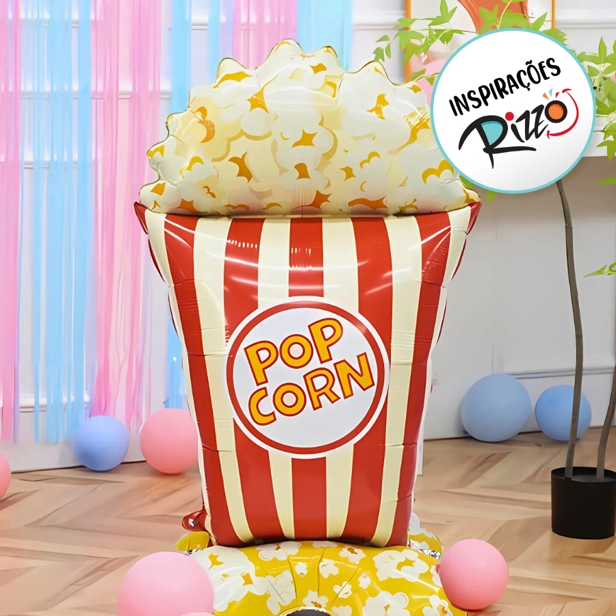 Balão decorativo em formato de pipoca, com base e acabamento metalizado. Mede 113x42x65cm. Ideal para festas temáticas e cenários especiais.