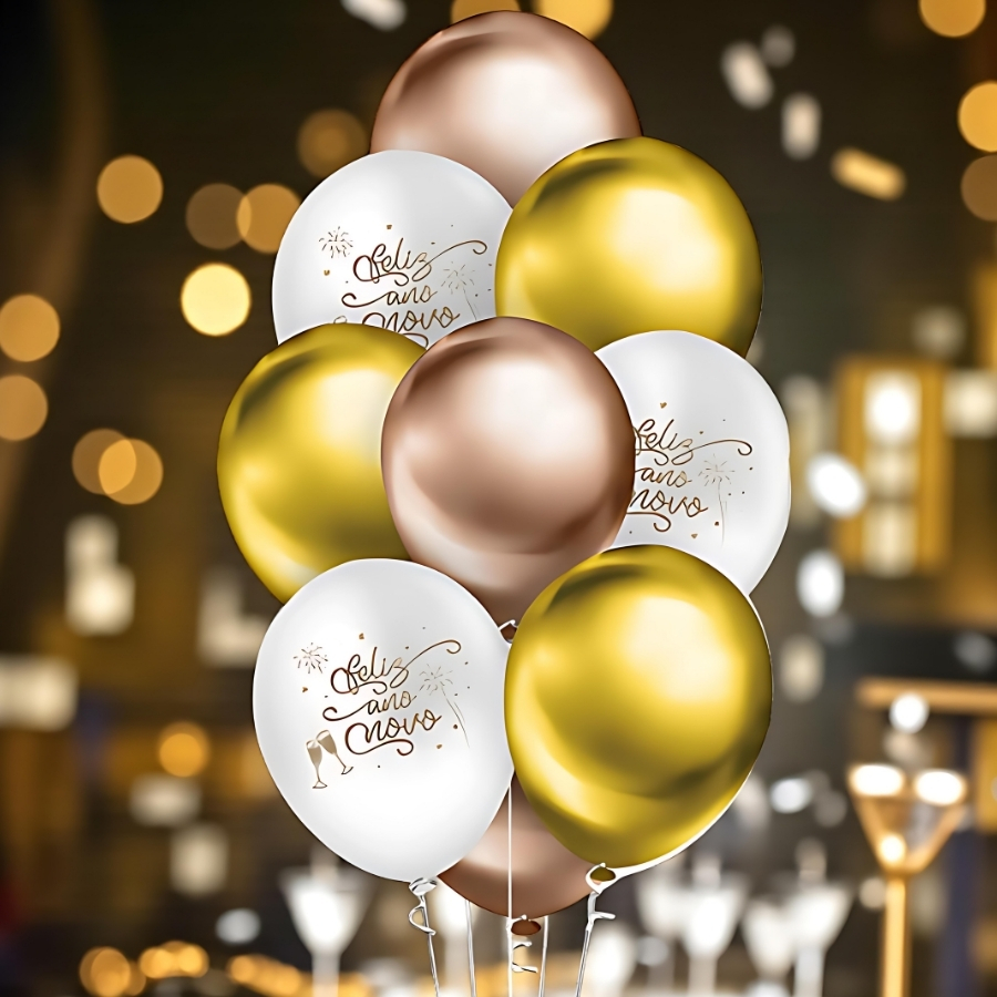 Balões de látex redondos, tamanho 10" (25cm), nas cores ouro, rose gold e branco. Ideais para decorações de Ano Novo, festas temáticas e eventos especiais.