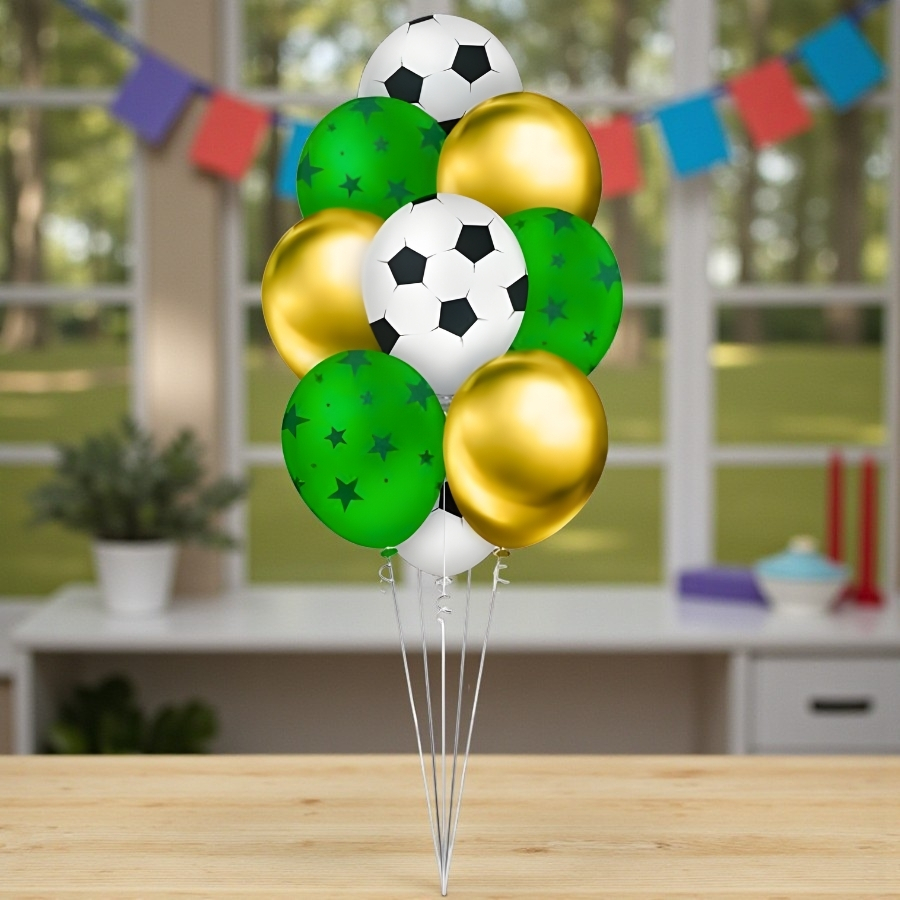 O Balão de Látex Redondo 10" Futebol possui 25cm de diâmetro, com acabamento impresso temático. Ideal para festas de aniversário, eventos esportivos e comemorações infantis.