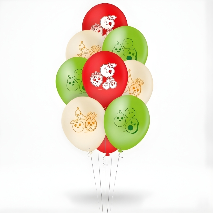 Balão de látex em formato redondo, tamanho 9 polegadas (aproximadamente 23cm), com estampa temática de frutinhas. Indicado para uso em decoração de festas e eventos. Pode ser inflado com ar ou gás apropriado. Produto descartável. Recomenda-se evitar exposição a objetos pontiagudos e calor excessivo para maior durabilidade.