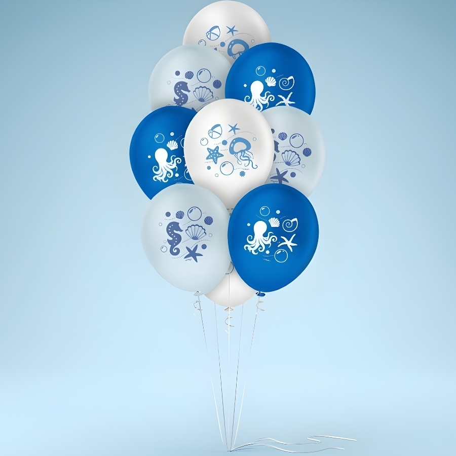 Balão de látex em formato redondo, tamanho 9 polegadas (aproximadamente 23cm), com estampa temática de fundo do mar. Indicado para uso em decoração de festas e eventos. Pode ser inflado com ar ou gás apropriado. Produto descartável. Recomenda-se evitar exposição a objetos pontiagudos e calor excessivo para maior durabilidade.