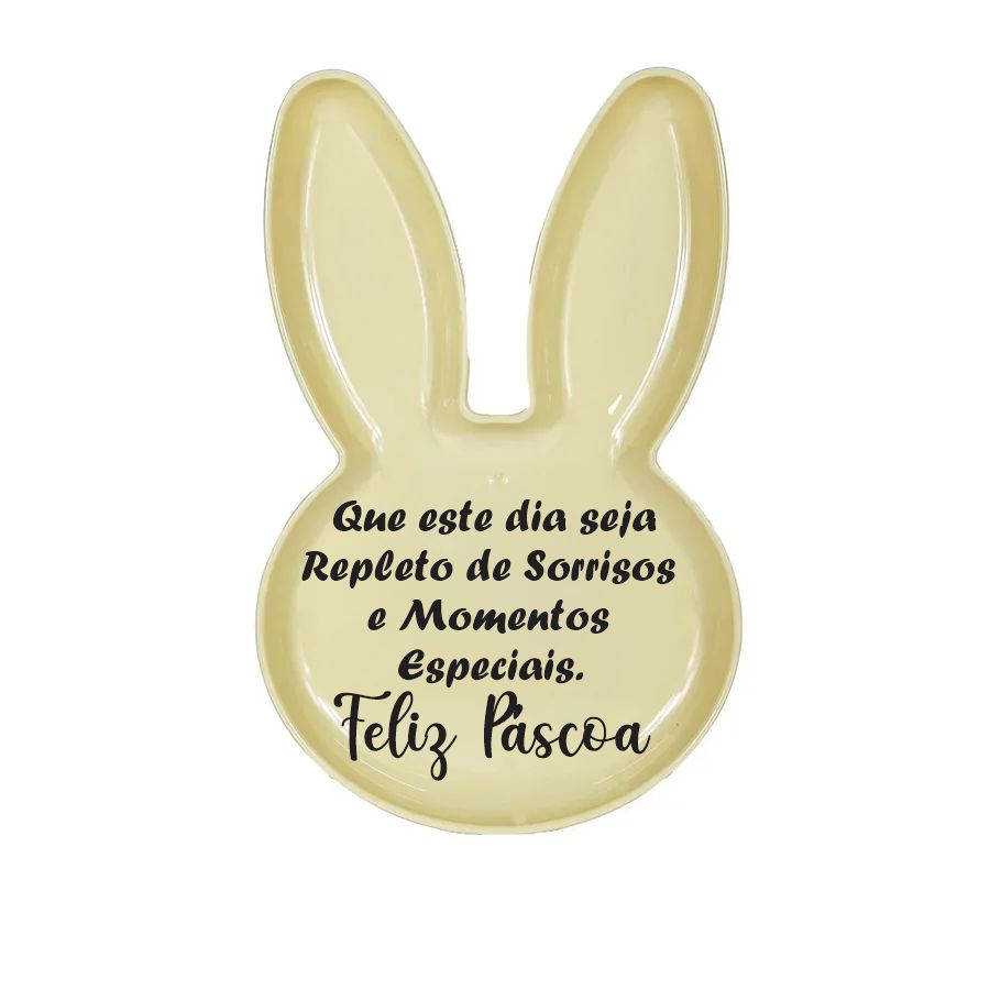 Bandeja decorativa com tema de coelho e frase de Páscoa, na cor amarelo, tamanho 25x15 cm. Charmosa e funcional.