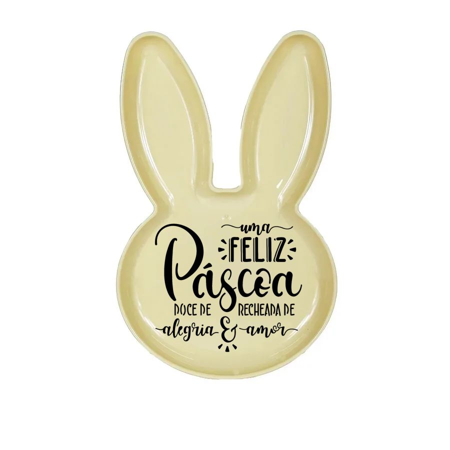 Bandeja decorativa com tema de coelho e frase de Páscoa, na cor amarelo, tamanho 25x15 cm. Charmosa e funcional.