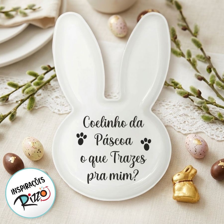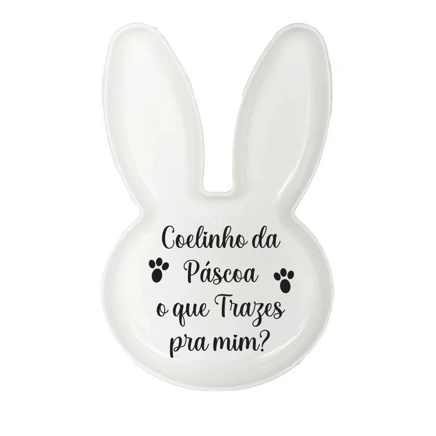 Bandeja decorativa com tema de coelho e frase de Páscoa, na cor branco, tamanho 25x15 cm. Charmosa e funcional.