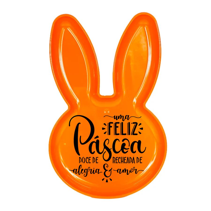 Bandeja decorativa com tema de coelho e frase de Páscoa, na cor laranja, tamanho 25x15 cm. Charmosa e funcional.