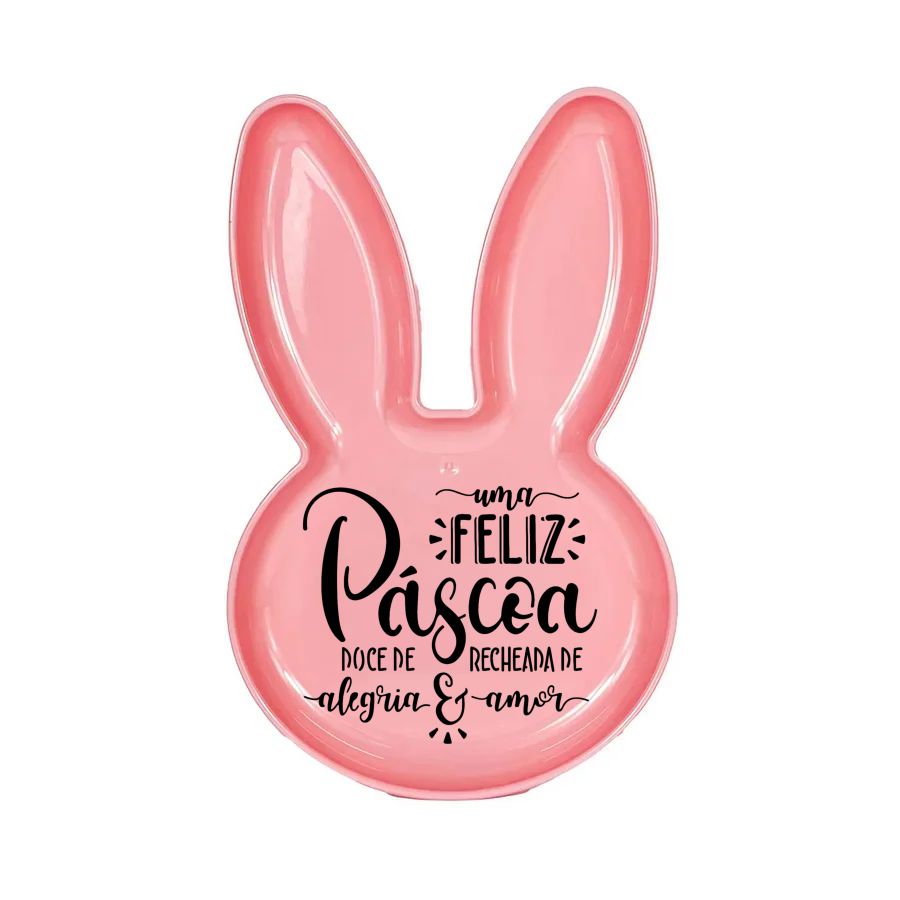 Bandeja decorativa com tema de coelho e frase de Páscoa, na cor rosa, tamanho 25x15 cm. Charmosa e funcional.