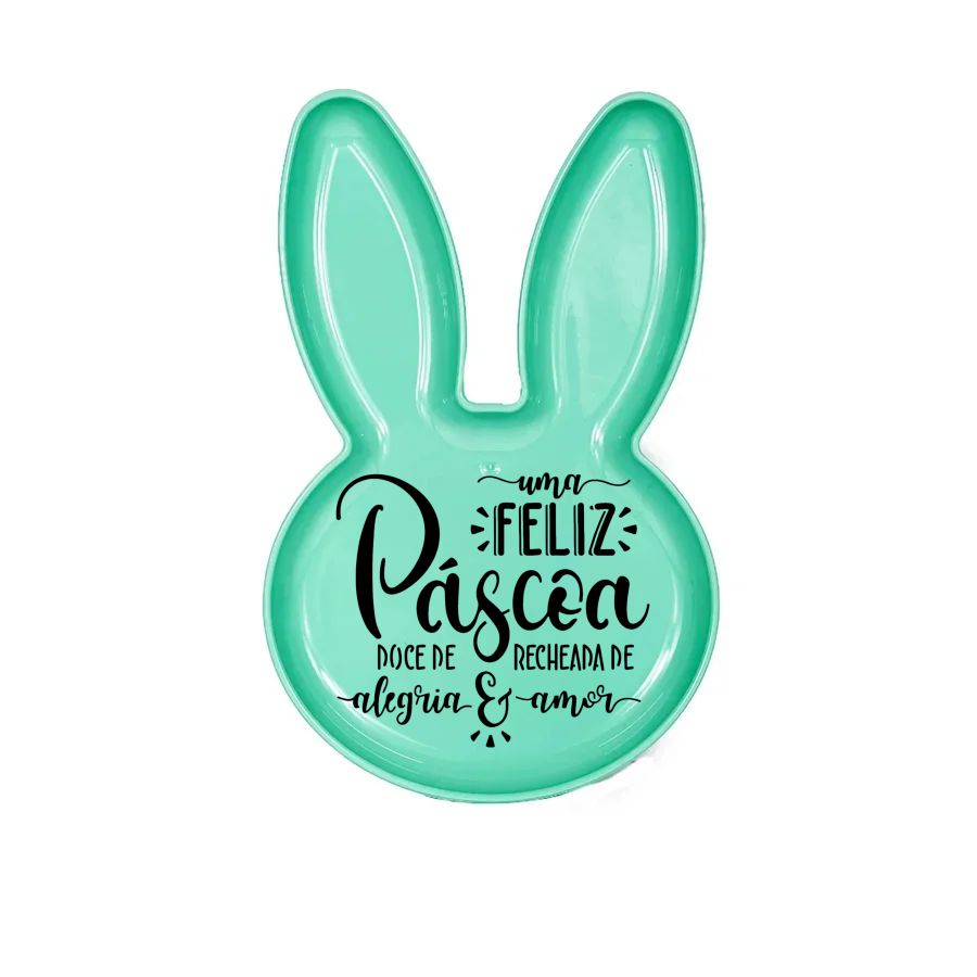 Bandeja decorativa com tema de coelho e frase de Páscoa, na cor verde claro, tamanho 25x15 cm. Charmosa e funcional.