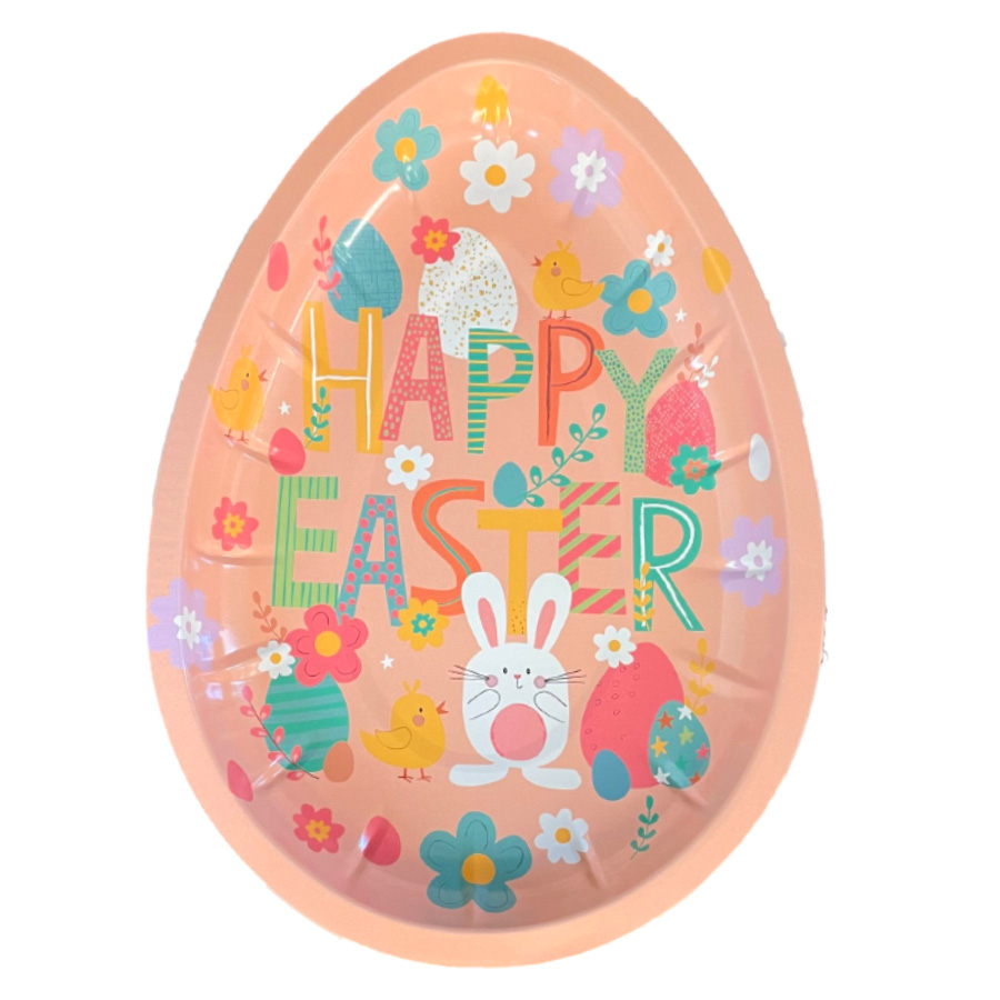 Bandeja de Metal com fundo salmão claro, com escrito ''Happy Easter'' colorido e decorado, além de desenhos de Coelhos de Páscoa fofo e Pintinhos delicados, Ovos de Páscoa e flores espalhados.