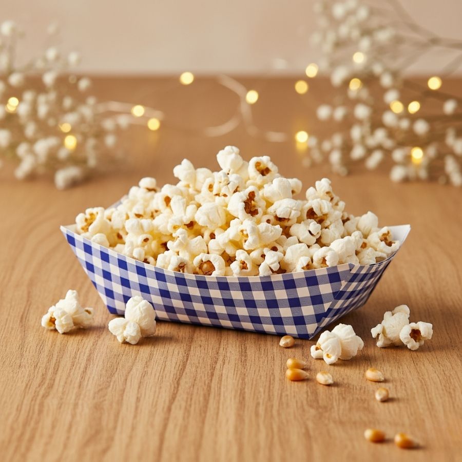 Bandeja de papel xadrez azul de 15 cm, ideal para servir pipoca, petiscos e finger foods em festas juninas com praticidade e estilo.