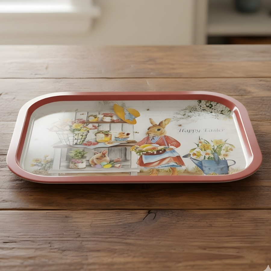 O produto é uma bandeja decorativa de Páscoa, com temática de coelha com cesta de ovos, medindo aproximadamente 37x25,5cm, indicada para uso decorativo em ambientes internos.