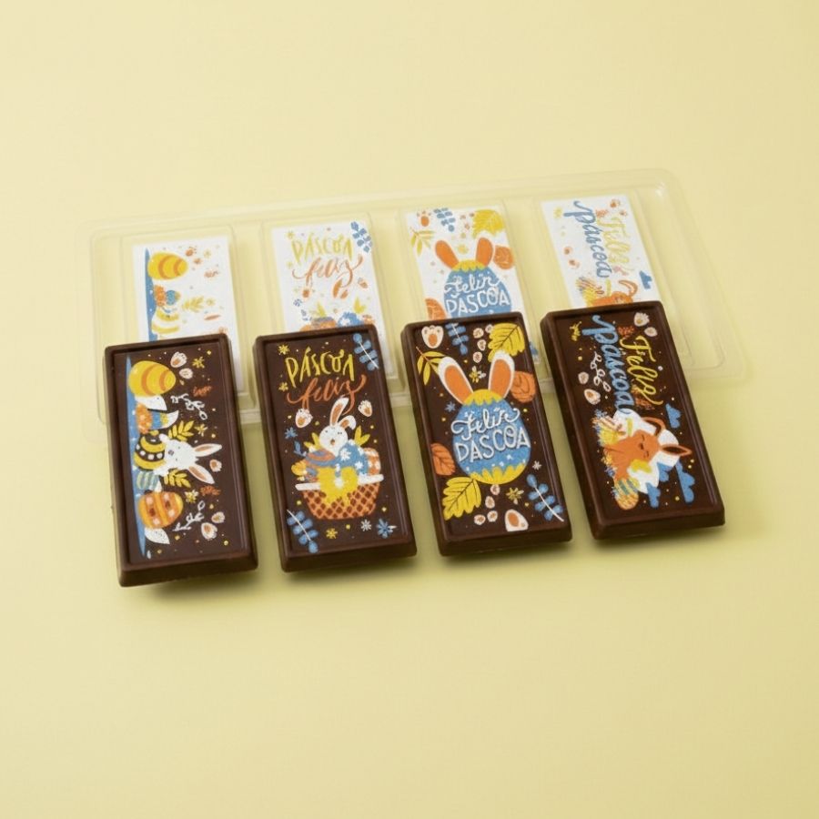 Blister decorativo com transfer para tablete de chocolate de Páscoa, com 4 cavidades e caixas PET inclusas. Ideal para chocolates personalizados, lembrancinhas e vendas sazonais.