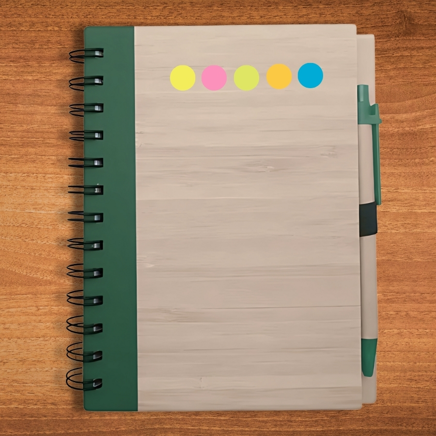 Bloco de anotações com caneta e autoadesivos, 70 folhas, 11,5x15,5cm, ideal para organização prática e criativa.