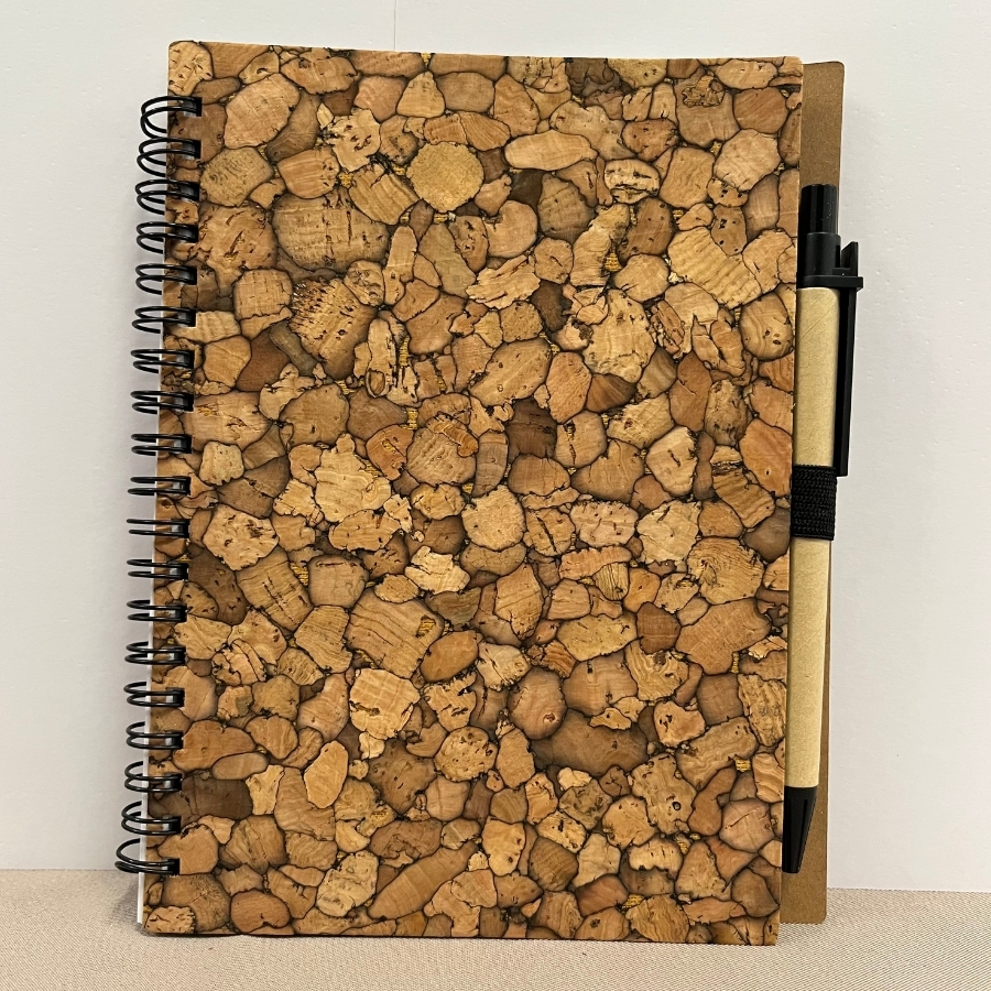 Bloco ecológico com caneta, 70 folhas, 13,5x17,5cm, disponível em acabamentos rústicos e naturais, ideal para uso diário ou presente sustentável.