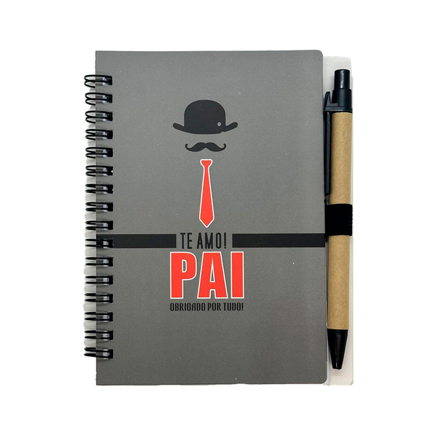Bloco para Anotação com 50 folhas, acompanhada por uma caneta kraft, capa estampada com fundo cinza com 1 faixa preta contornando, destacando um chapéu derby, bigode francês e gravata longa vermelha, com a mensagem abaixo "Te amo! Pai, Obrigado por Tudo"