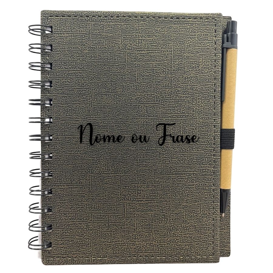 Bloco em couro com personalização preta, 70 folhas e caneta inclusa. Um presente funcional com toque de requinte.