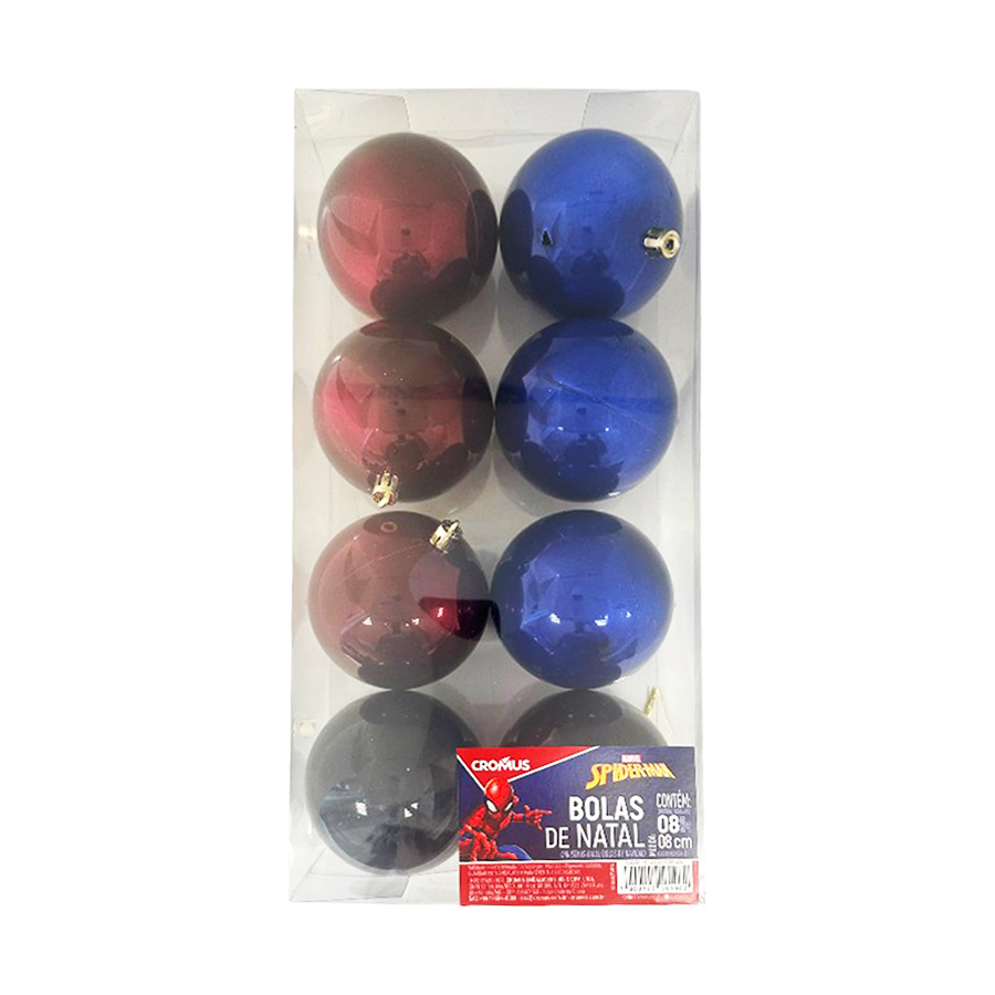 Pacote com 8 bolas de Natal de 8cm de diâmetro com a temática do Homem-Aranha. As bolas apresentam cores intensas como azul escuro, marsala e preto, inspiradas no traje icônico do super-herói.