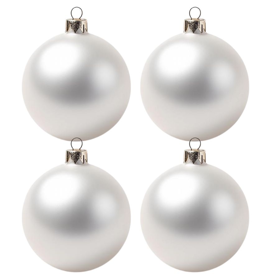 Bolas de Natal branca em diferentes tamanhos, ideais para decoração de árvores, guirlandas e arranjos festivos. Os tons de branco podem variar.