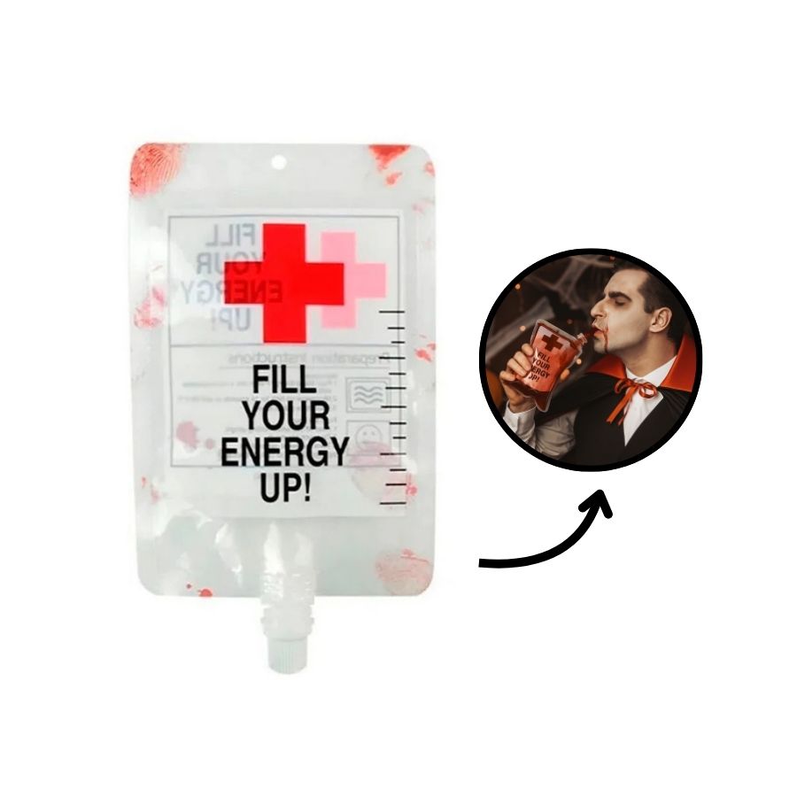 Bolsa de Sangue com desenhos e escritos característicos, como ''Fill Your Energy Up!'', com bico ideal para bebidas de Halloween.