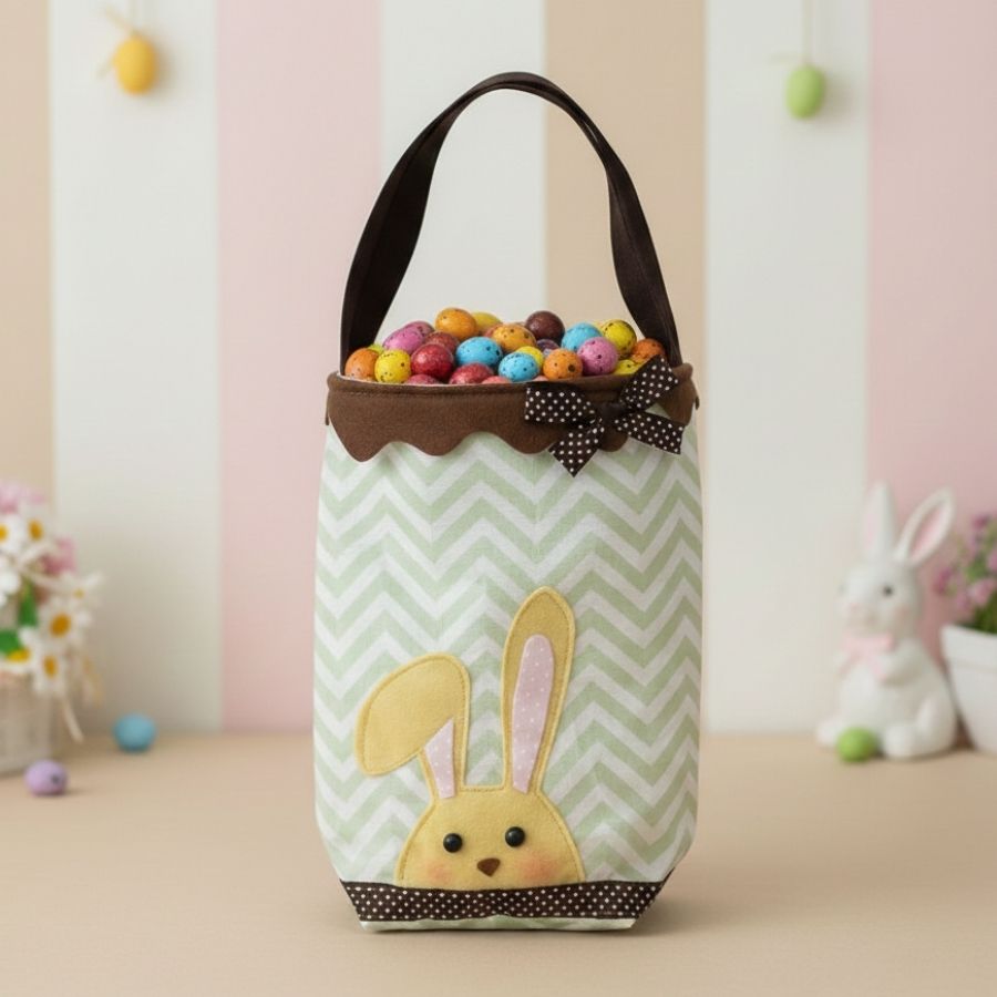 O padrão Chevron, conhecido por suas linhas em zigue-zague, confere um visual dinâmico à bolsa, enquanto o verde proporciona uma tonalidade vibrante e moderna. O coelho de feltro bordado introduz um elemento mais descontraído e festivo, criando um contraste encantador com o padrão geométrico.