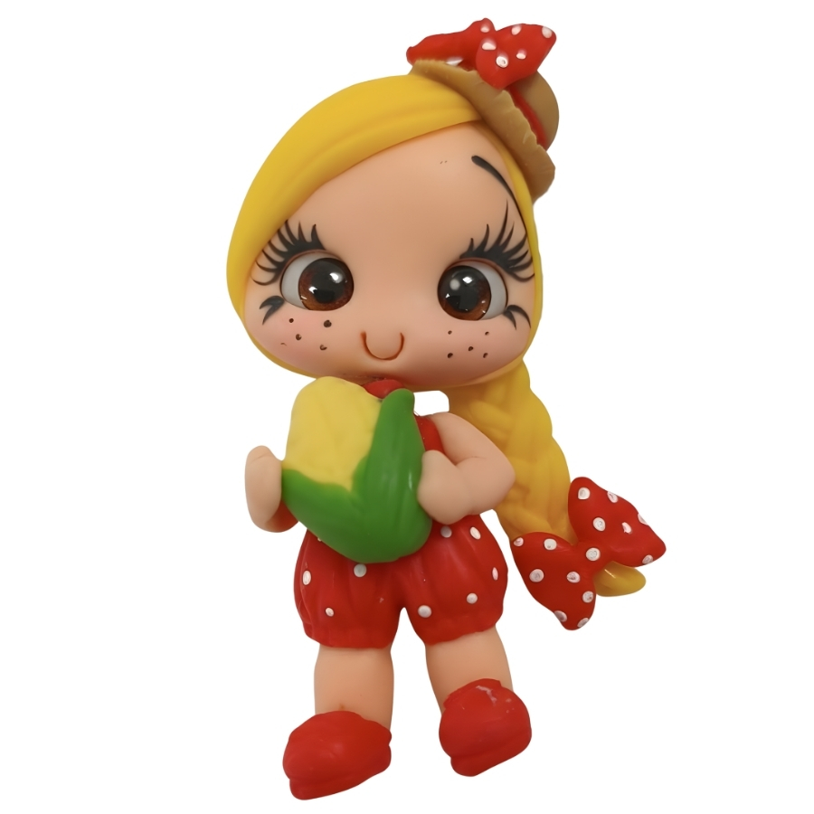 Produzido em biscuit, o enfeite decorativo representa uma menina do campo com roupa vermelha e milho, possuindo aproximadamente 6cm de altura. Pode ser utilizado em festas juninas, mesas decorativas, vitrines, lembrancinhas e diversas composições temáticas, agregando valor visual ao ambiente.