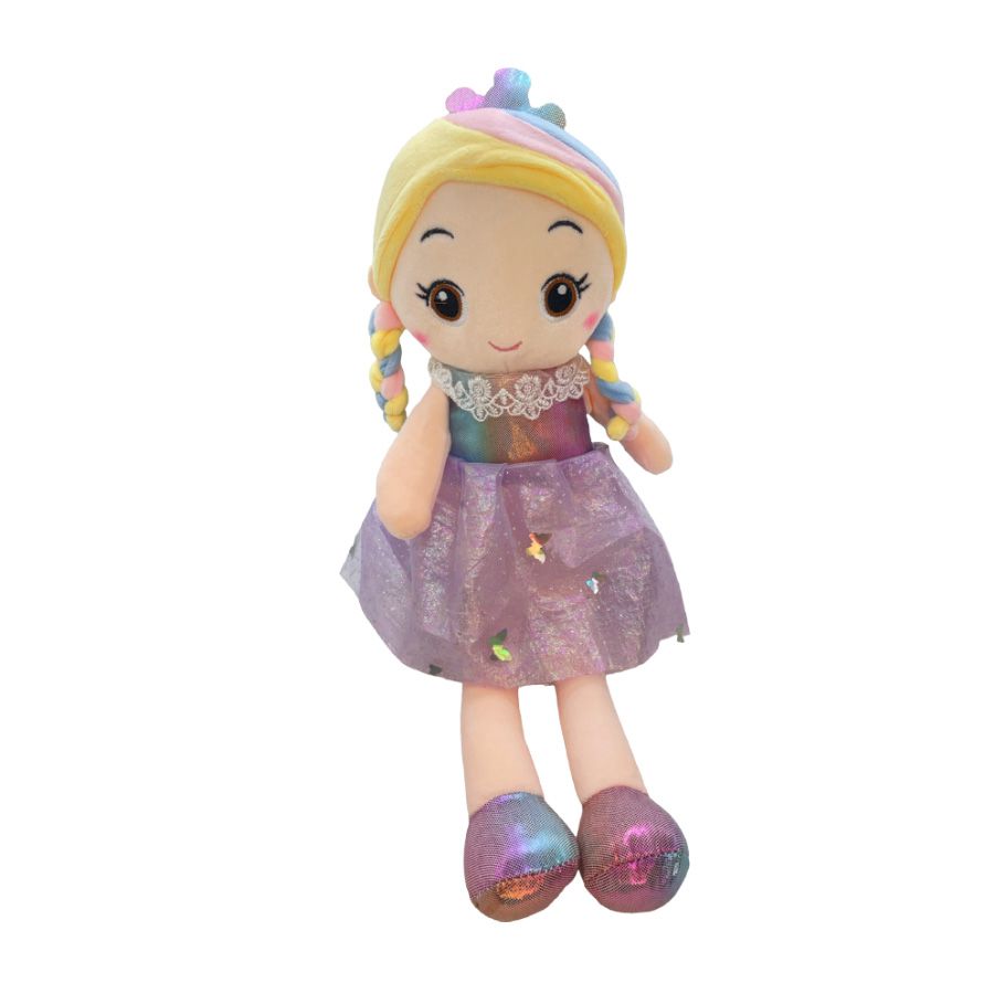 Boneca de Pelúcia vestida com vestido cintilante na cor roxa, com detalhes de borboletas aplicadas na saia, ela tem cabelos amarelos, com detalhes em azul e rosa, feito trança, com coroa e sapatos de tecido também cintilantes