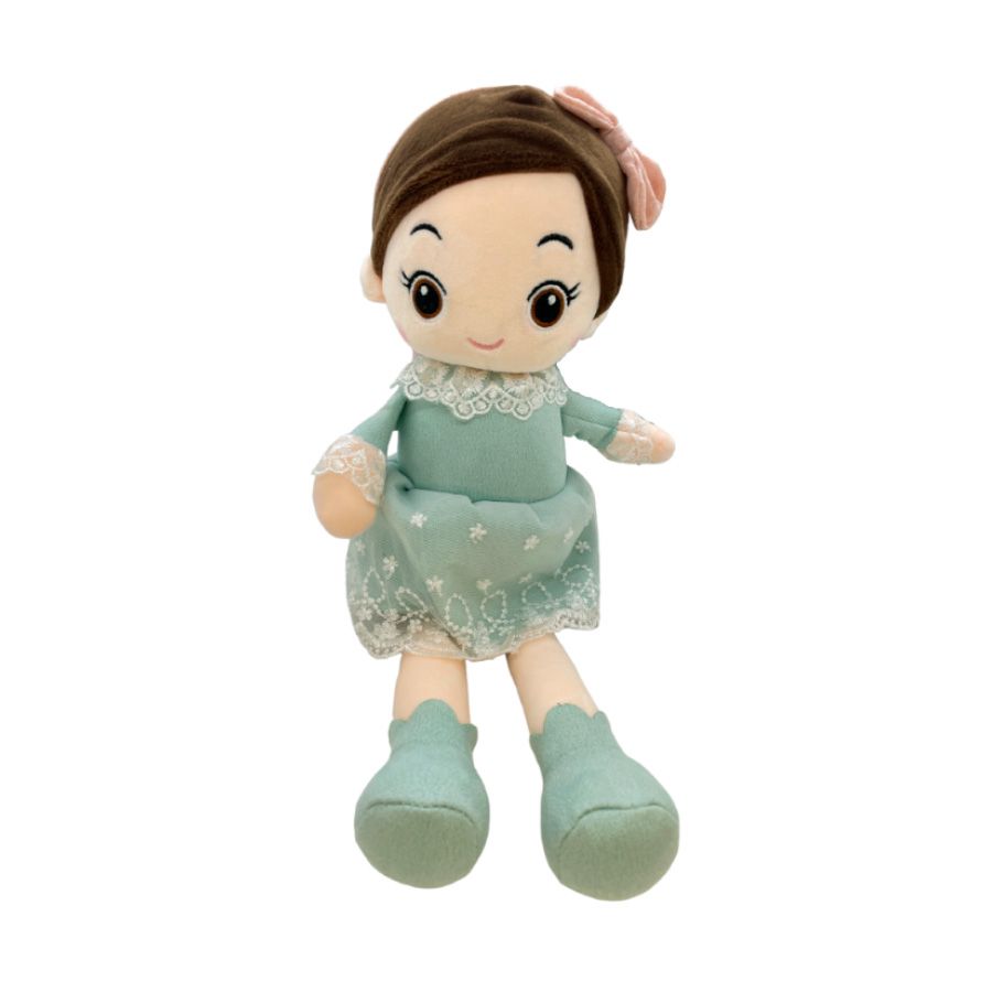 Boneca de Pelúcia com cabelo marrom feito rabo e tiara de laço na cor rosa, com vestido na cor verde com detalhes bordados em branco e sapato de tecido verde