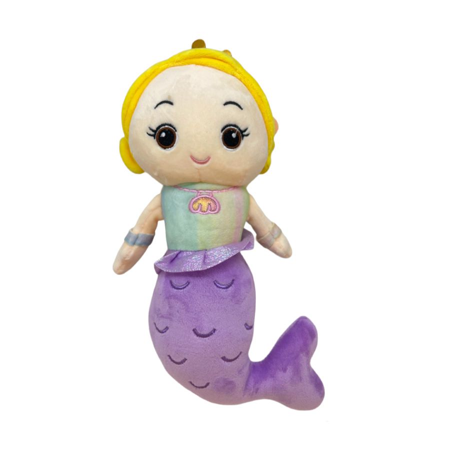 Boneca Sereia de Pelúcia, com cauda roxa, cabelos loiros e coroa