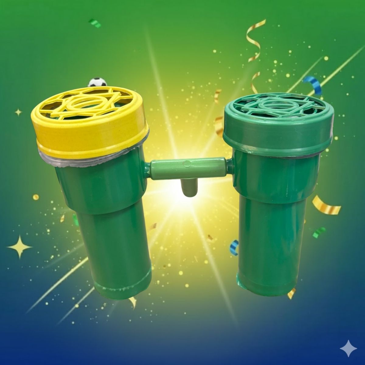 A Buzina Dupla é o acessório ideal para animar a torcida durante os jogos e comemorações da Copa do Mundo. Na cor verde, ela representa a paixão pelo futebol e garante um som marcante para celebrar cada lance, gol ou vitória, tornando o momento ainda mais empolgante.