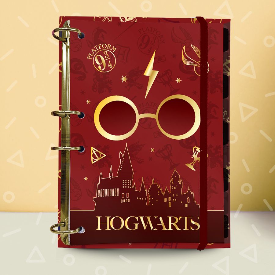 Caderno argolado com 144 folhas decoradas inspiradas em Harry Potter e 10 divisórias plasticas coloridas.
