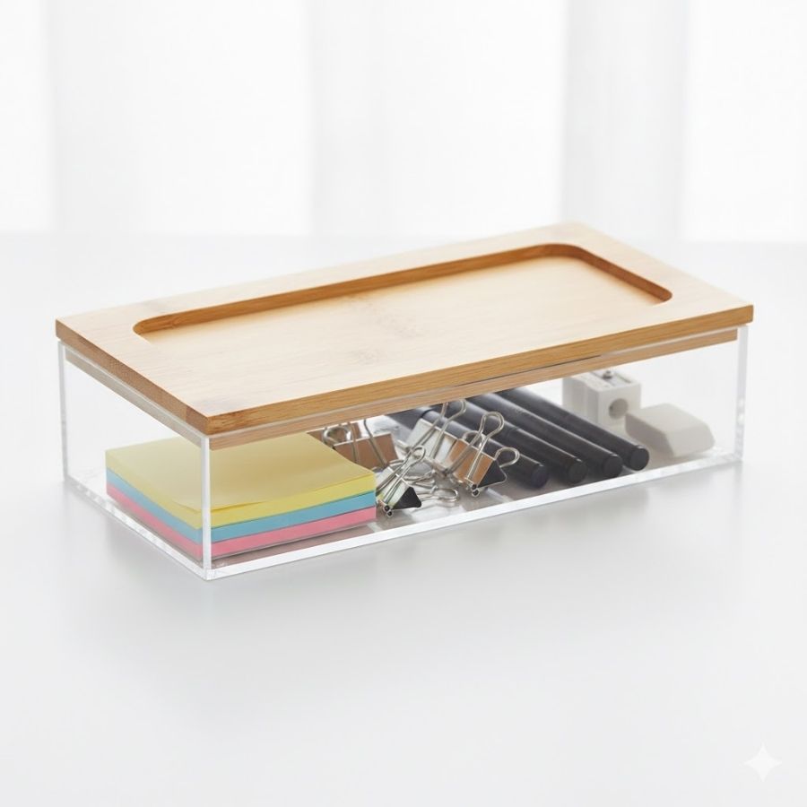 A Caixa Acrílica com tampa de madeira é uma peça versátil e elegante para home decor e organização da casa. A transparência do acrílico combinada ao acabamento natural da madeira cria um visual moderno, leve e atemporal, ideal para diferentes estilos de decoração para casa.