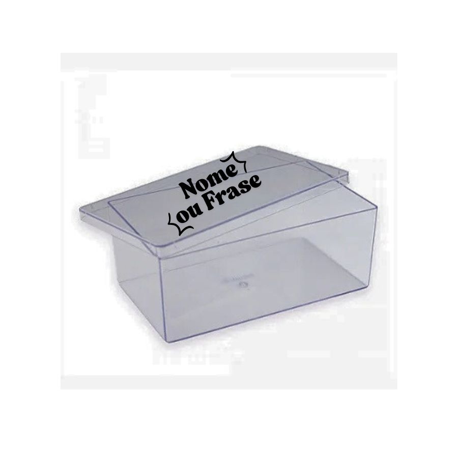 Caixa acrílica retangular com personalização em preto, ideal para presentes personalizados com estilo.