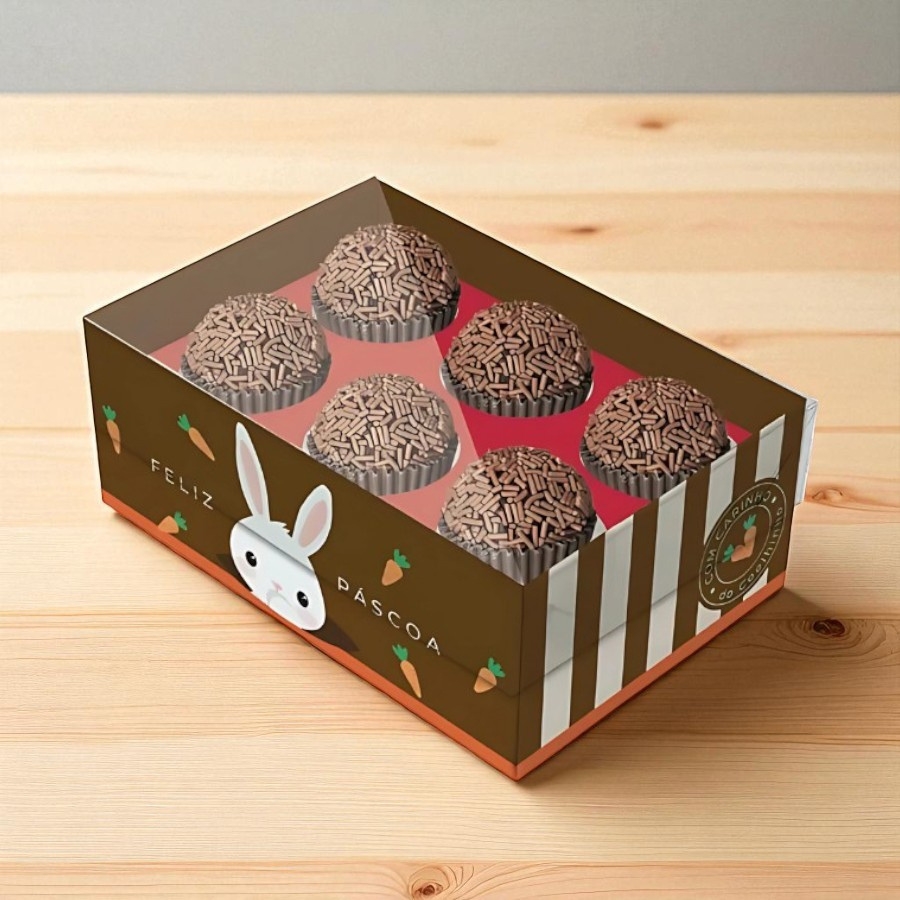Seu visor transparente permite visualizar os docinhos sem precisar abrir a embalagem, valorizando ainda mais o trabalho do confeiteiro. Ideal para presentear clientes, familiares ou amigos, essa caixa une praticidade e sofisticação, transformando simples doces em lembranças inesquecíveis de Páscoa.