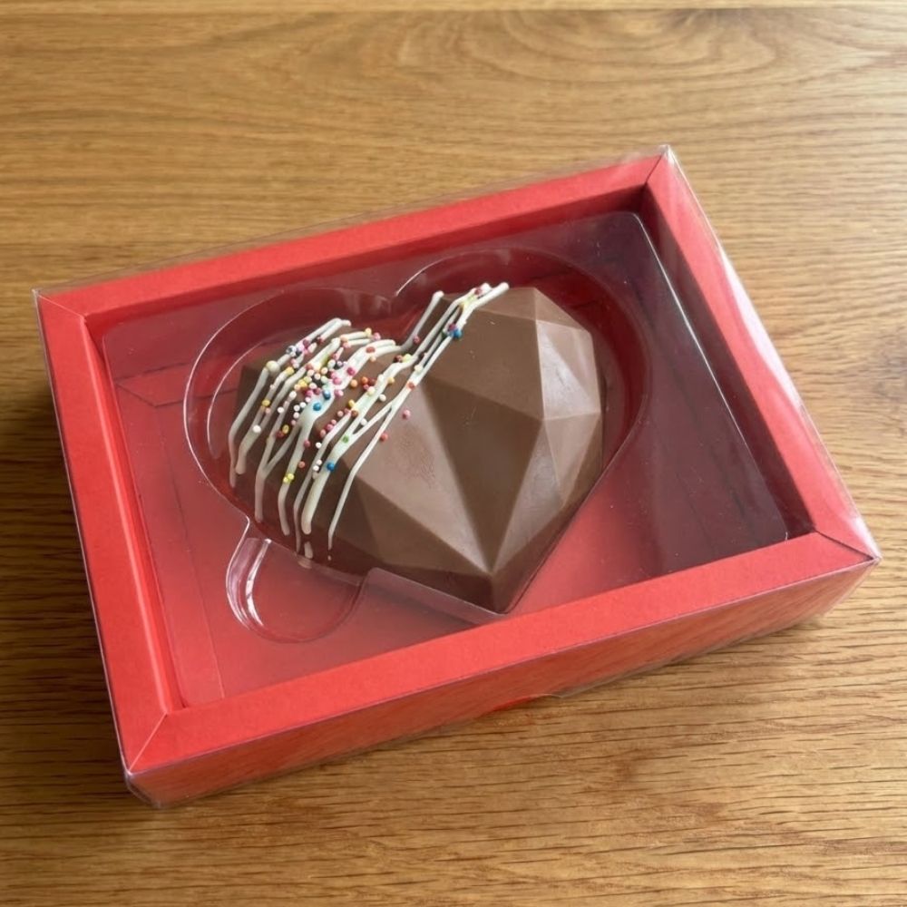 A Caixa Coração Plano é perfeita para apresentar uma única peça de forma delicada e marcante. Com 1 cavidade, foi desenvolvida para acomodar 1 coração plano, garantindo encaixe adequado e valorizando o formato do chocolate ou doce com uma apresentação limpa e organizada.