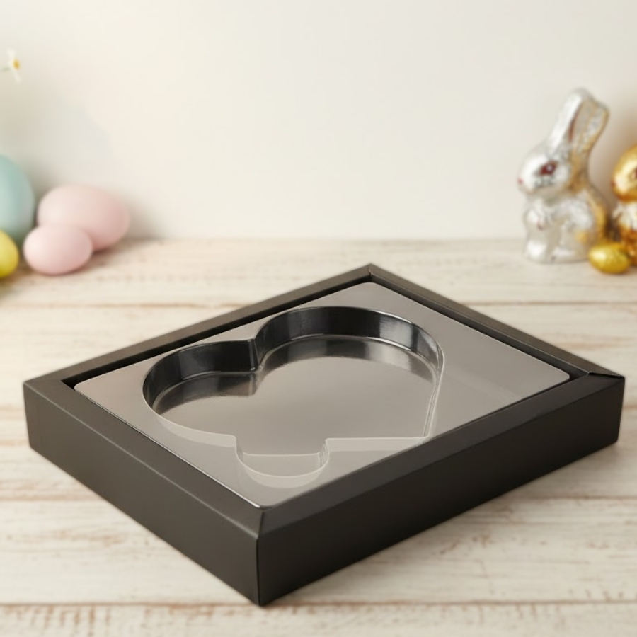 A Caixa Coração Plano é ideal para apresentar uma única peça de forma elegante e impactante. Com 1 cavidade, foi desenvolvida para acomodar 1 coração plano, garantindo um encaixe adequado e valorizando o formato do chocolate ou doce com um visual limpo e sofisticado.