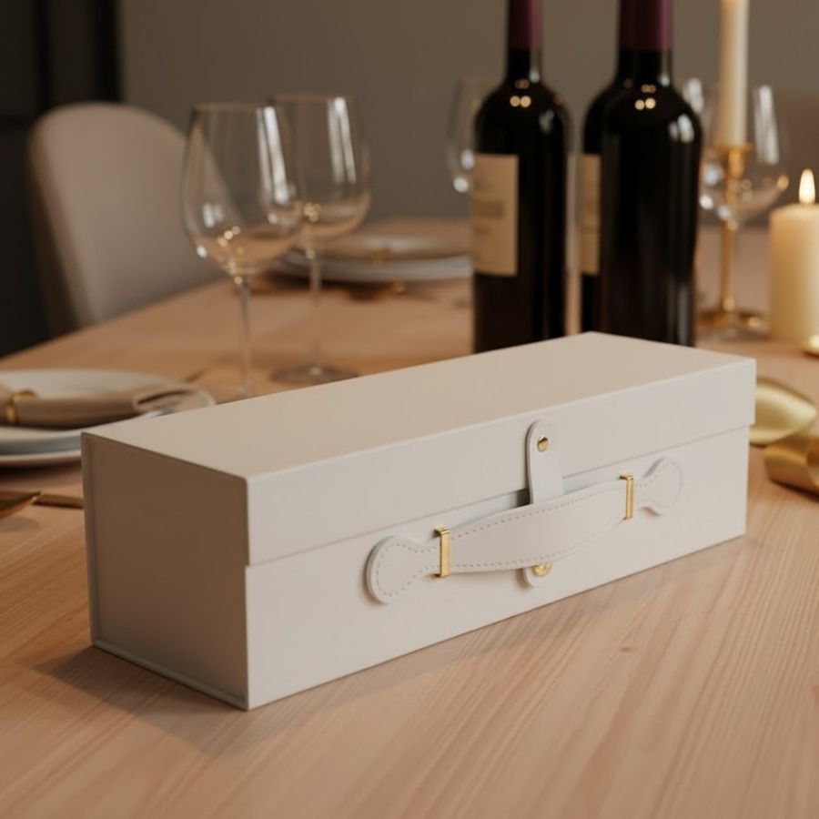 Caixa branca rígida com detalhes dourados, alça e fechamento por ímã, ideal para embalar garrafas de vinho e presentes sofisticados.