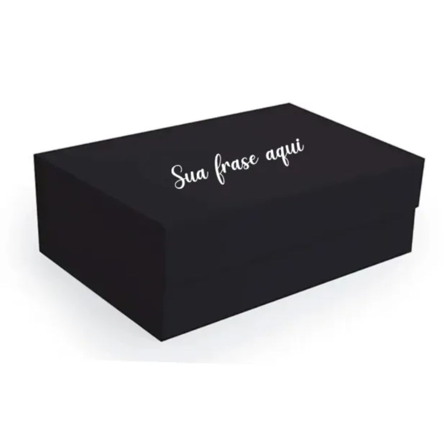 Possui 1 Caixa de Papel Rígido Retangular Preto com Ímã Personalizada com Adesivo Branco.