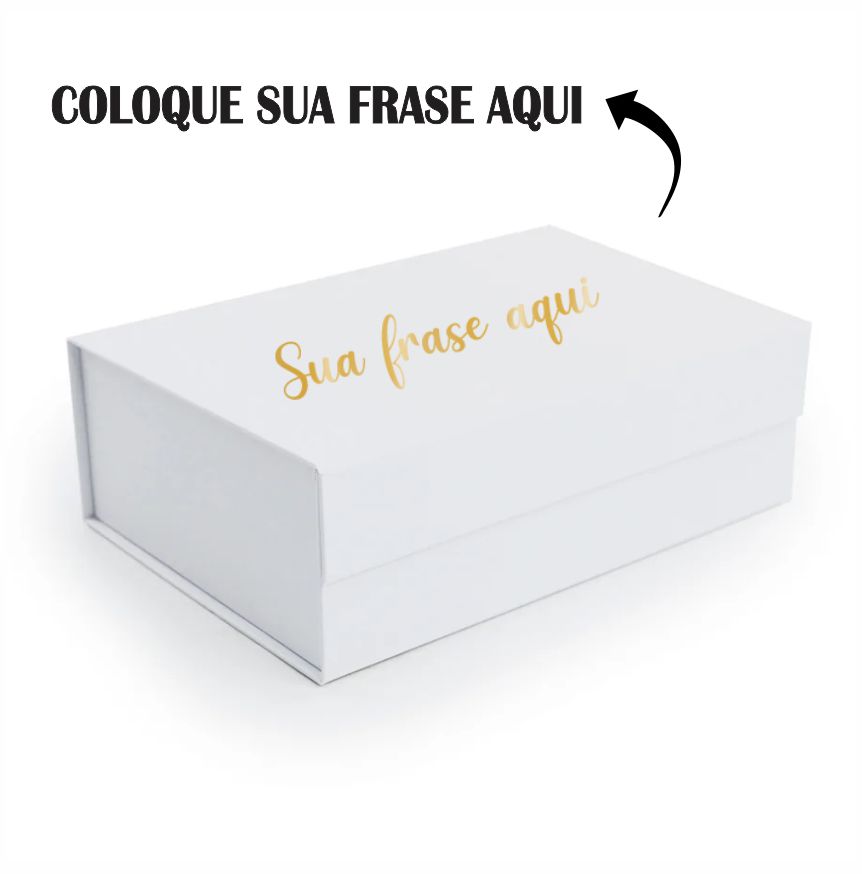 Possui 1 Caixa de Papel Rígido Retangular Branca com Ímã Personalizada com Adesivo Dourado.
