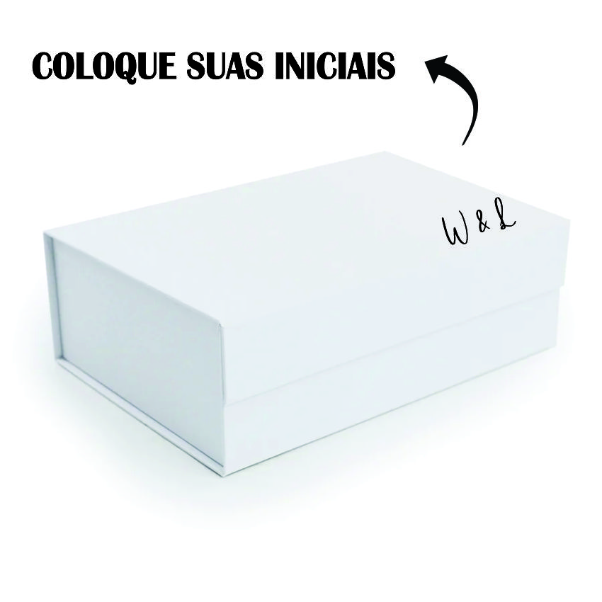 Possui 1 Caixa de Papel Rígido Retangular Branco com Ímã Personalizada com Adesivo Preto.