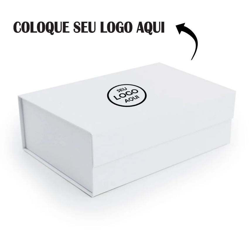 Possui 1 Caixa de Papel Rígido Retangular Branca com Ímã Personalizada com Adesivo Preto.