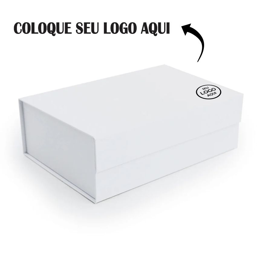 Possui 1 Caixa de Papel Rígido Retangular Branca com Ímã Personalizada com Adesivo Preto.