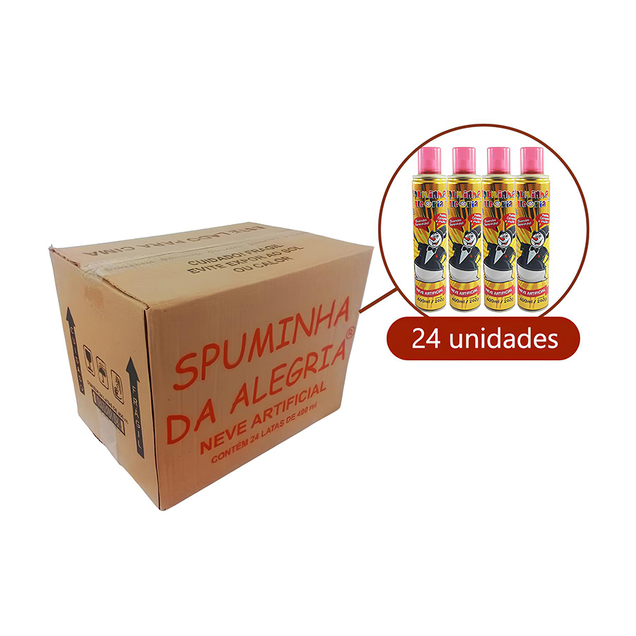 Caixa fechada contendo 24 unidades do spray Espuminha da Alegria, com 400ml cada. Espuma artificial em spray.