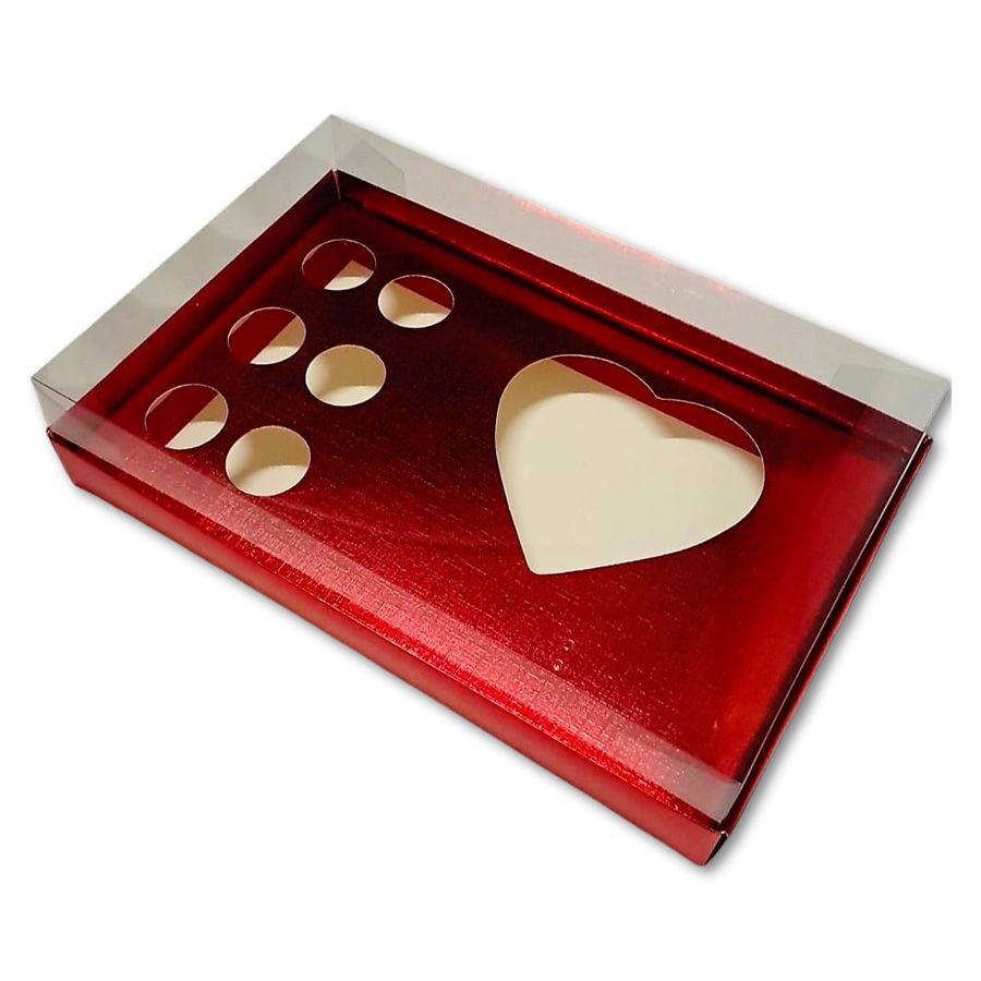 Caixa para meio ovo com formato de coração com espaço para 6 doces do tipo brigadeiro na cor vermelho